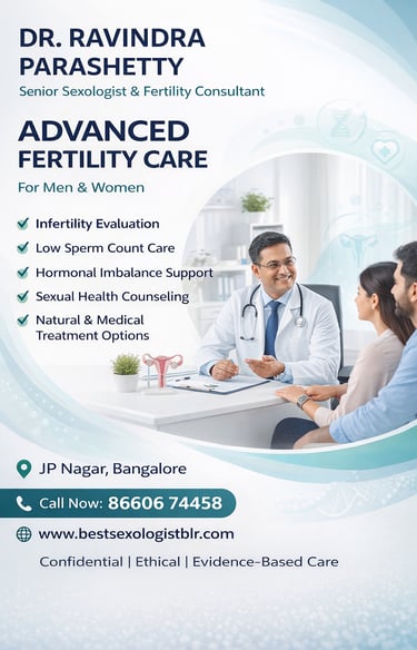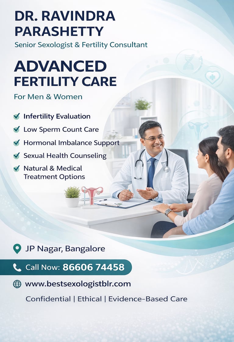 Dr. Ravindra Parashetty is a well-known senior sexologist and fertility consultant in JP Nagar, Bangalore, offering ethical, confidential, and evidence-based care for individuals and couples facing fertility and sexual health concerns. With years of clinical experience, Dr. Parashetty focuses on accurate diagnosis, patient education, and personalized treatment planning.