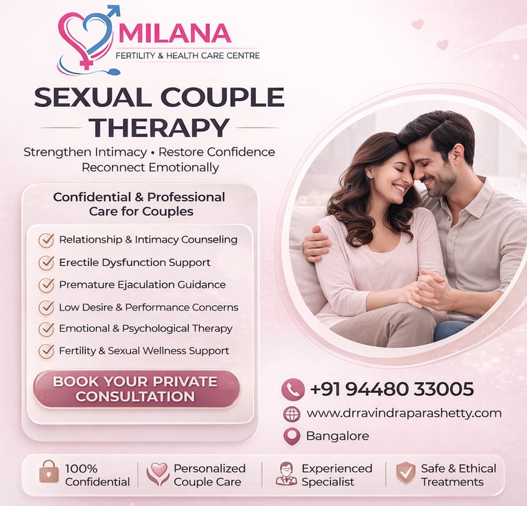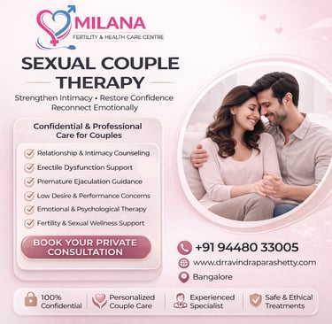 At Milana Fertility & Health Care Centre, we are committed to helping couples achieve a fulfilling and healthy relationship through expert sexual couple therapy in RR Nagar Bangalore. Our goal is to provide compassionate care that improves both emotional and physical well-being.