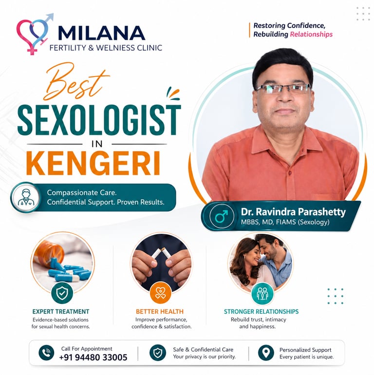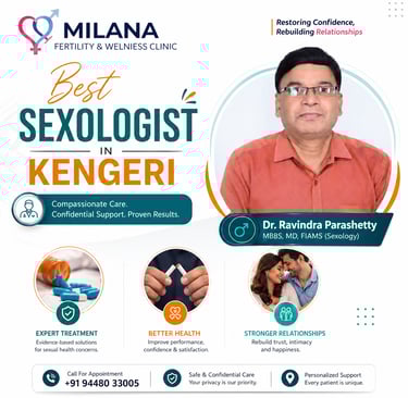 When it comes to sensitive health concerns, choosing the best sexologist in Kengeri is crucial for achieving long-term wellness, confidence, and relationship satisfaction. Sexual health is not just about physical well-being—it directly impacts emotional balance, self-esteem, and the quality of your relationships. At Milana Fertility & Wellness Clinic, Dr. Ravindra Parashetty provides advanced, confidential, and evidence-based sexology treatments in Kengeri, helping individuals and couples regain control over their intimate health.