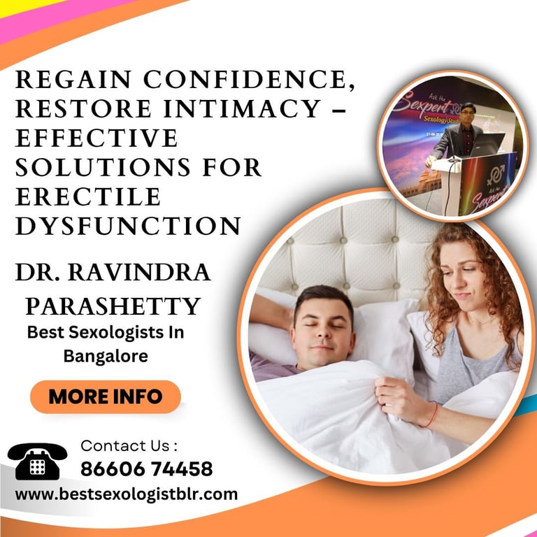 Under the guidance of Dr. Ravindra Parashetty, a respected sexologist in Bangalore, patients receive a confidential and judgement-free environment where they can openly discuss symptoms and concerns. Many people search for erectile dysfunction treatment in Bangalore because they want reliable information instead of misleading or unrealistic claims. Our approach is centred on understanding the underlying factors that may contribute to ED, such as lifestyle habits, stress, hormonal issues, or medical conditions.