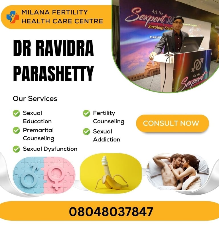 Welcome to Milana Fertility Health Care Centre, one of the trusted centers in Bangalore for professional and confidential sexual health counseling and therapy. Led by Dr. Ravidra Parashetty, our centre focuses on helping individuals and couples understand and overcome challenges related to sexual health, relationships, and fertility through professional guidance and scientific methods.