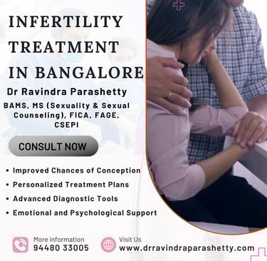 Infertility is a sensitive and emotionally challenging journey for many couples. At the Infertility Treatment Center in Bangalore, Dr. Ravindra Parashetty offers supportive, ethical, and personalized care to help couples understand their fertility concerns and move closer to parenthood with confidence. With extensive qualifications including BAMS, MS (Sexuality & Sexual Counseling), FICA, FAGE, and CSEPI, Dr. Parashetty provides a holistic and evidence-based approach to reproductive wellness.