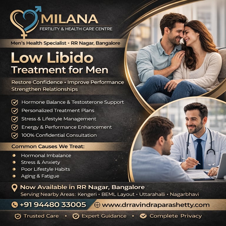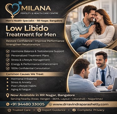 At Milana Fertility & Health Care Centre, we offer comprehensive and personalized low libido treatment for men in RR Nagar Bangalore using modern medical approaches.
