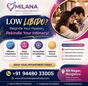 At Milana Fertility & Health Care Centre, under the expert care of Dr. Ravindra Parashetty, we offer advanced and confidential low libido treatment in RR Nagar Bangalore. Our approach focuses on identifying the root cause and providing personalized treatment plans to help you restore passion, improve intimacy, and enhance overall well-being.