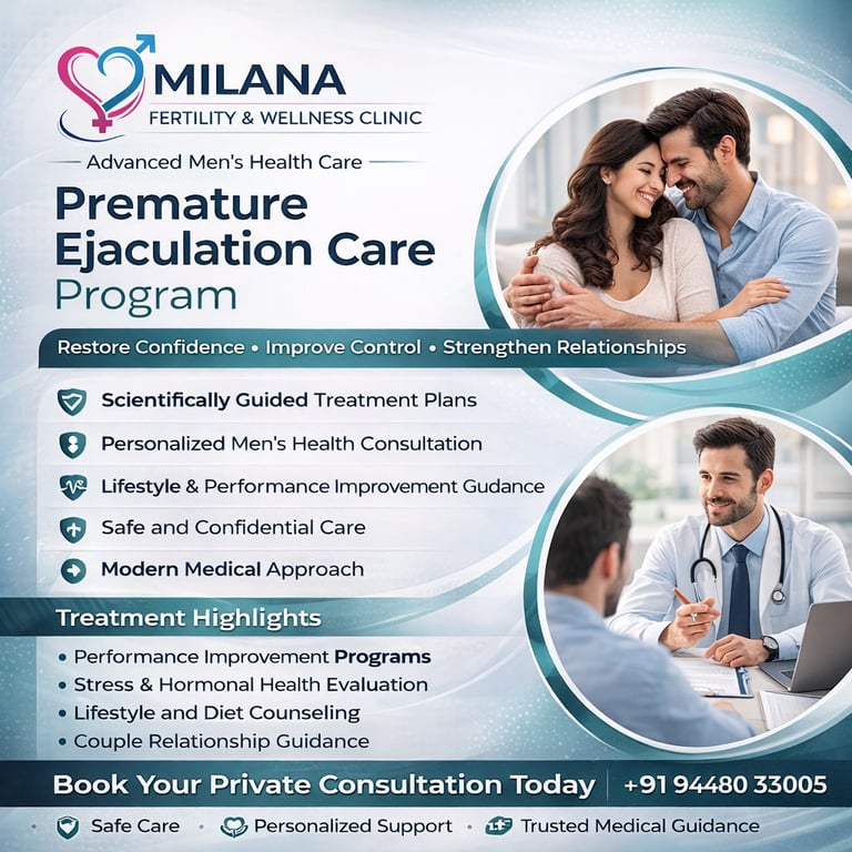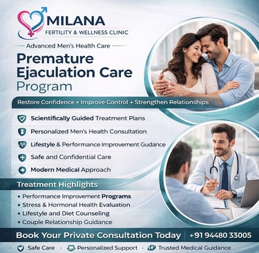 Premature ejaculation is one of the most common male sexual health concerns affecting many men at different stages of life. It can impact confidence, emotional well-being, and relationship satisfaction. At Milana Fertility & Wellness Clinic, we provide professional Premature Ejaculation Treatment designed to support men through a modern, confidential, and medically guided approach. Our goal is to help patients improve control, enhance confidence, and strengthen overall relationship wellness.