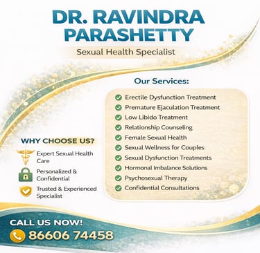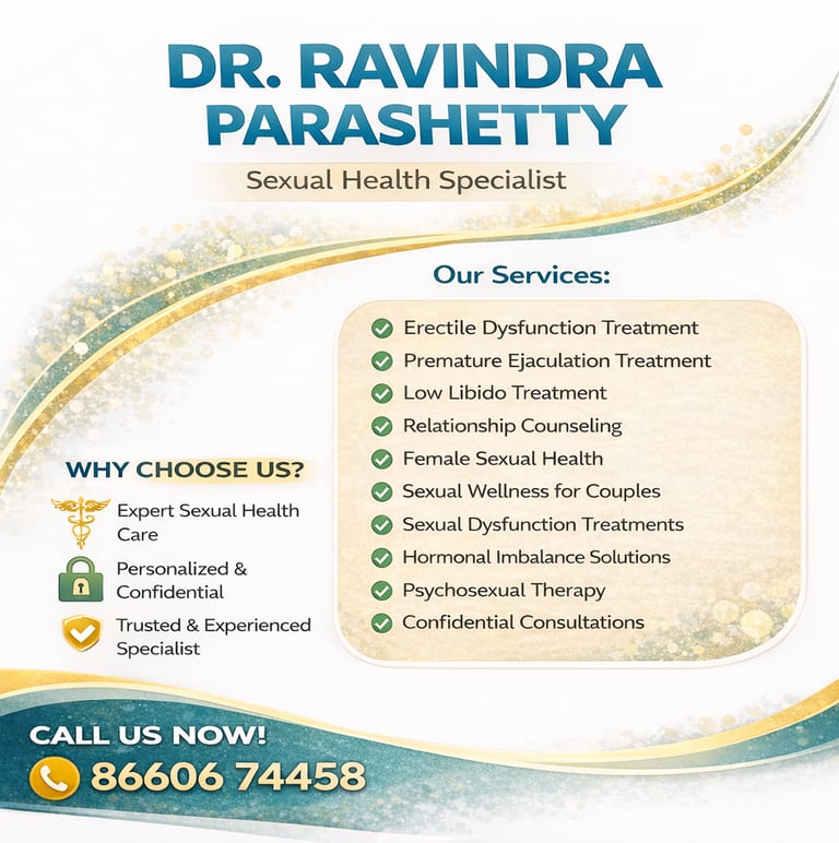 Dr. Ravindra Parashetty provides treatment and counseling for a wide range of sexual health conditions. Services include support for erectile dysfunction, premature ejaculation, low libido, and other sexual dysfunction issues in men. The clinic also addresses female sexual health concerns, hormonal imbalance–related problems, and emotional or psychological factors affecting intimacy.